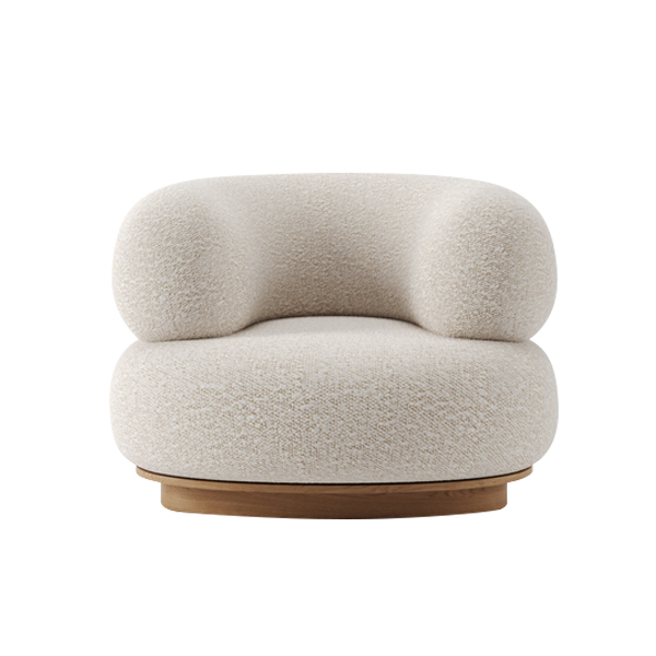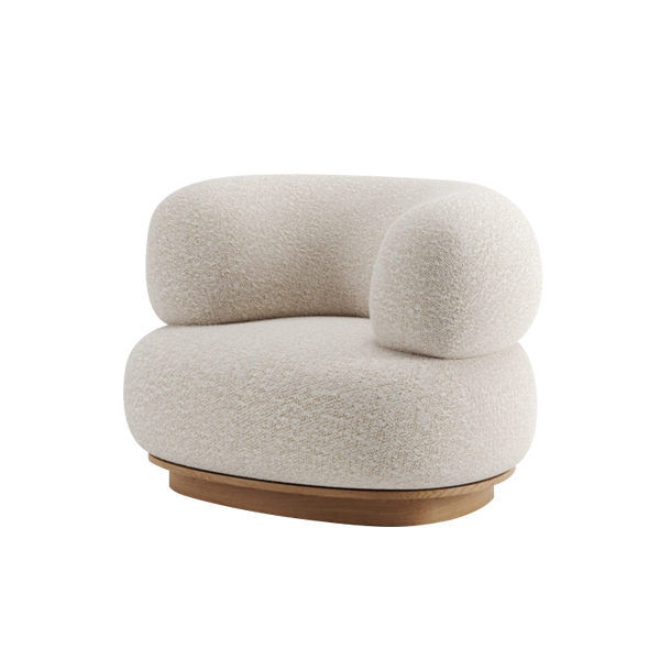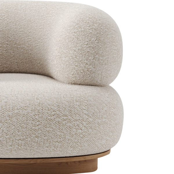 Embodying a modern minimalist style, the chair presents a unique silhouette that is simple yet luxurious. It features a soft, textured boucle fabric, adding an elegant touch. Supported by a solid wood base, this chair provides optimal stability and durability. The natural wood finish on the base adds a classic element that complements the modern design perfectly. With a proportional size, measuring approximately 80 cm x 60 cm x 40 cm, it fits beautifully in various spaces without taking up too much room.