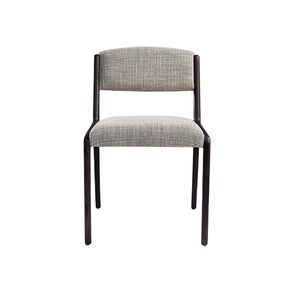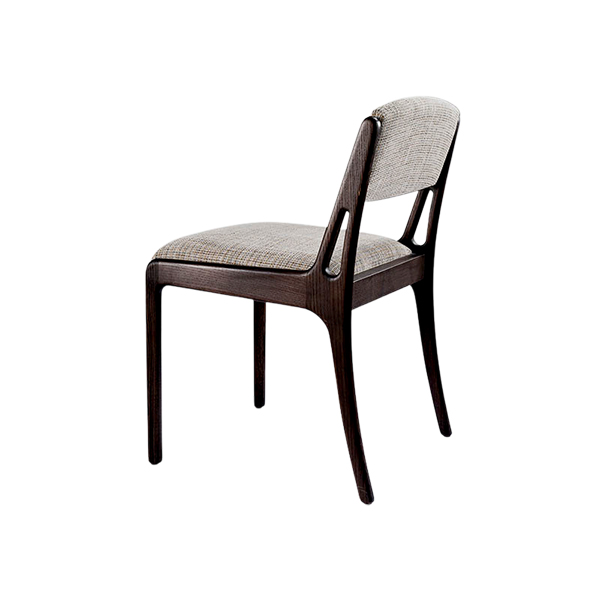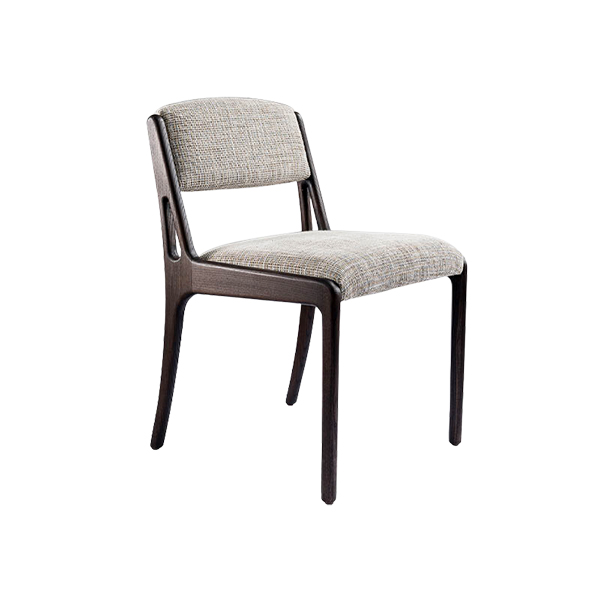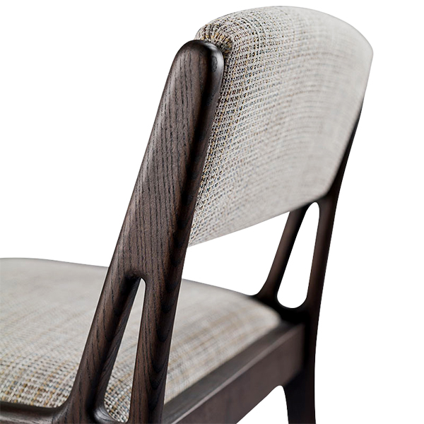 Seat and backrest are upholstered in a soft, textured fabric that exudes elegance, offering optimal comfort and a luxurious appearance. The fabric features a subtle woven pattern in neutral tones, making it versatile for various interior themes. Balance between the dark wood frame and the light colored fabric creates a visually striking contrast. What sets this chair apart is the unique wood detailing on the sides of the backrest, which adds a sense of lightness and robustness. These intricate cutouts not only enhance the aesthetics but also reflect a touch of contemporary artistry blended with functionality. The gently curved edges on the chair legs provide a modern look while ensuring stability.
