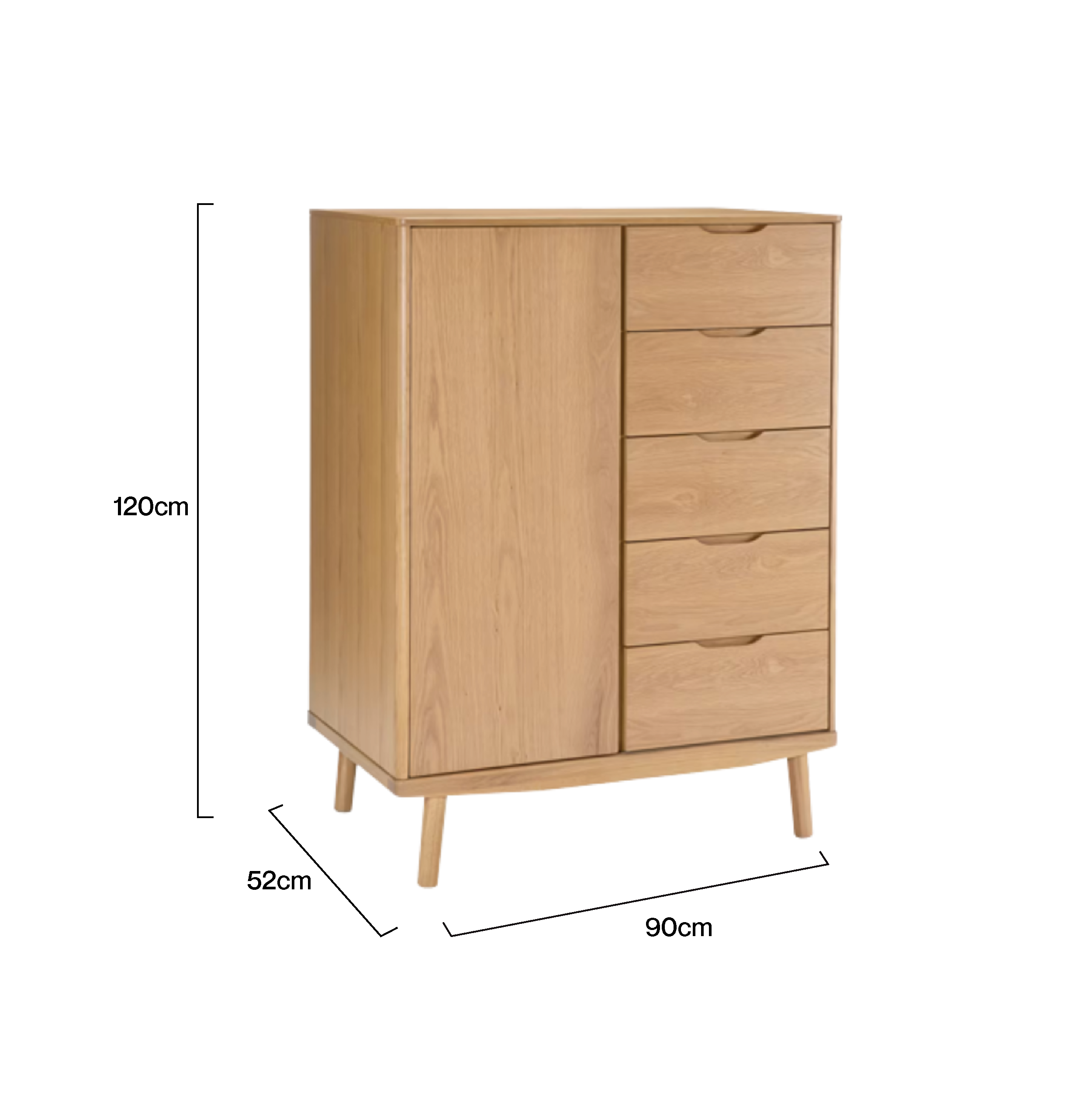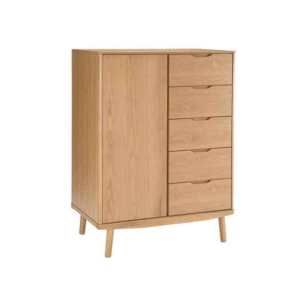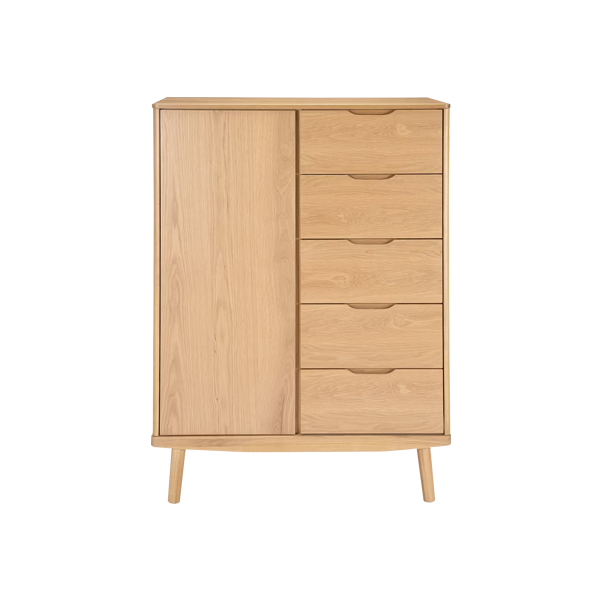 Esha Modern Wardrobe is a smart solution for those who desire multifunctional furniture with minimalist modern aesthetics. Designed with ideal proportion measuring 90x52x120 cm. This wardrobe combines the practicality of a cabinet and the elegance of a wardrobe in one unit. With a large single door on the left and five spacious drawers on the right. This wardrobe offers an efficient storage system suitable for personal bedrooms to villas.