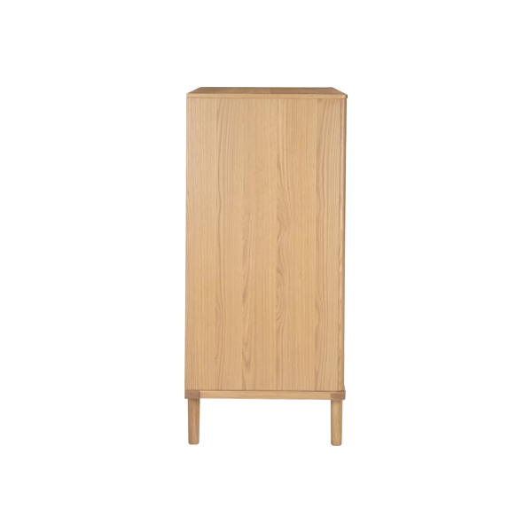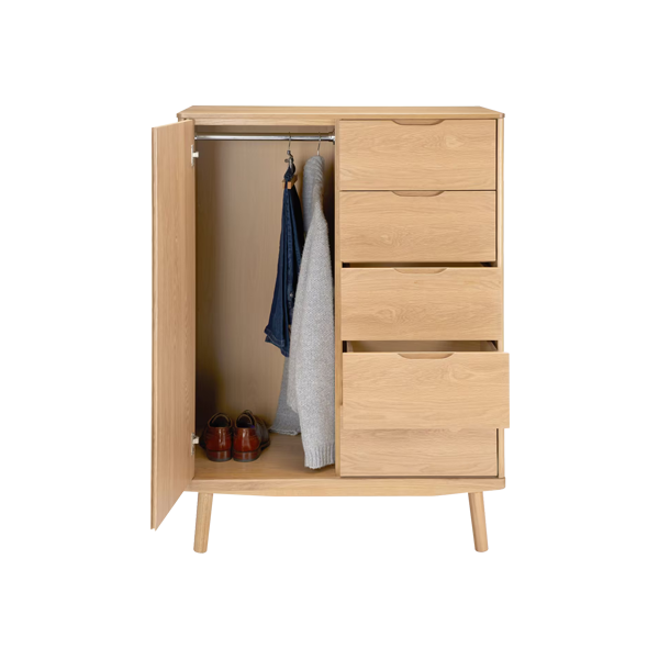 The main material choice is teak wood due to its strength and natural grain beauty. Finishing uses an eco friendly waterbased technique that reveals the natural wood’s warm tone. Transition from the door to the drawers feels harmonious thanks to the integrated handle design. Inside the main compartment, a stainless steel hanger is provided for hanging clothes such as jackets or shirts. Meanwhile, the base area is spacious enough for shoes or additional storage boxes. Each drawer features a soft close mechanism, offering a smooth and silent opening and closing experience.