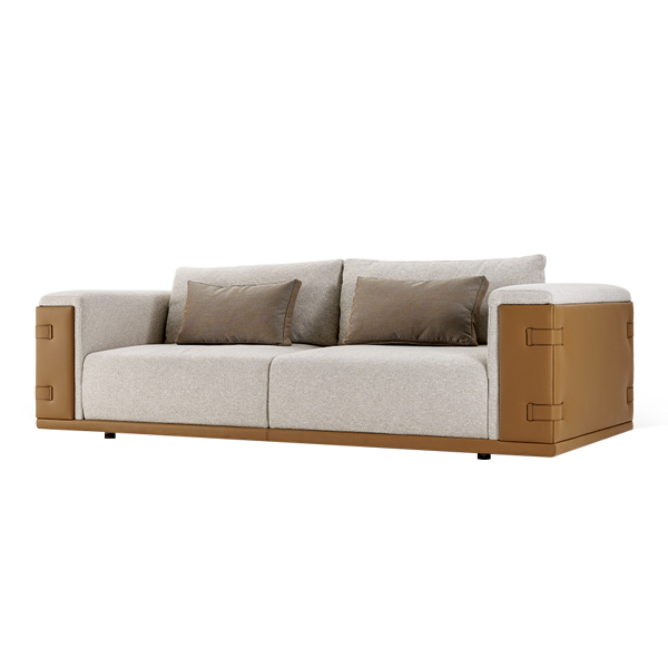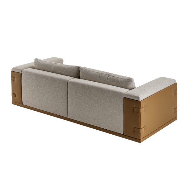 In high-quality soft grey fabric, it offers a smooth and inviting surface for relaxation. Featuring a dual-fabric design, the backrest and seat are with durable polyester, ensuring long-lasting comfort for modern families. The sofa’s frame is with golden-brown synthetic leather along its sides and base, adding a touch of elegance and creating a stunning contrast. Decorative buckle accents on the sides enhance its unique character and reinforce its modern appeal. For both robustness and sophistication, this sofa reflects a lifestyle centered on practicality and refinement. Its spacious seating can comfortably accommodate up to three adults, making it ideal for hosting guests or relaxing with family. The plush backrest and seat with high-quality foam to ensure maximum comfort. Complementing the sofa are two rectangular decorative cushions in matching tones, offering extra support while enhancing its overall aesthetic.