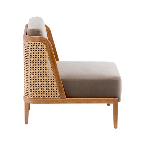 Hara Lounge Chair is lounge chair that seamlessly combines modern minimalism with natural charm of woven rattan and solid teak wood. With a sturdy frame, this chair offers exceptional durability and strength. Wood is with a bleaching technique, enhancing its natural grain and adding a warm inviting ambiance. This chair features a spacious seat and high-density foam cushioning wrap in soft polyester fabric.