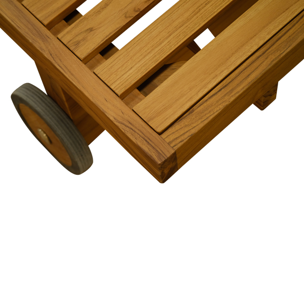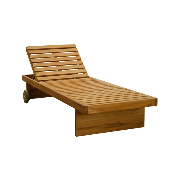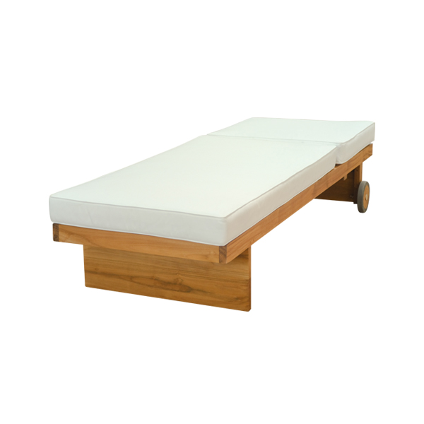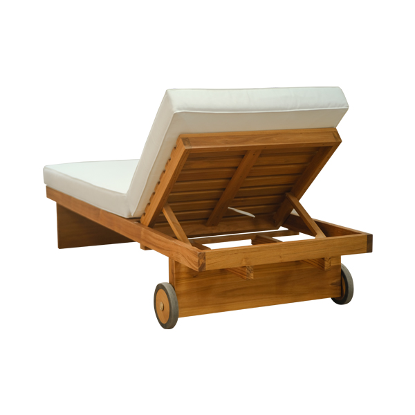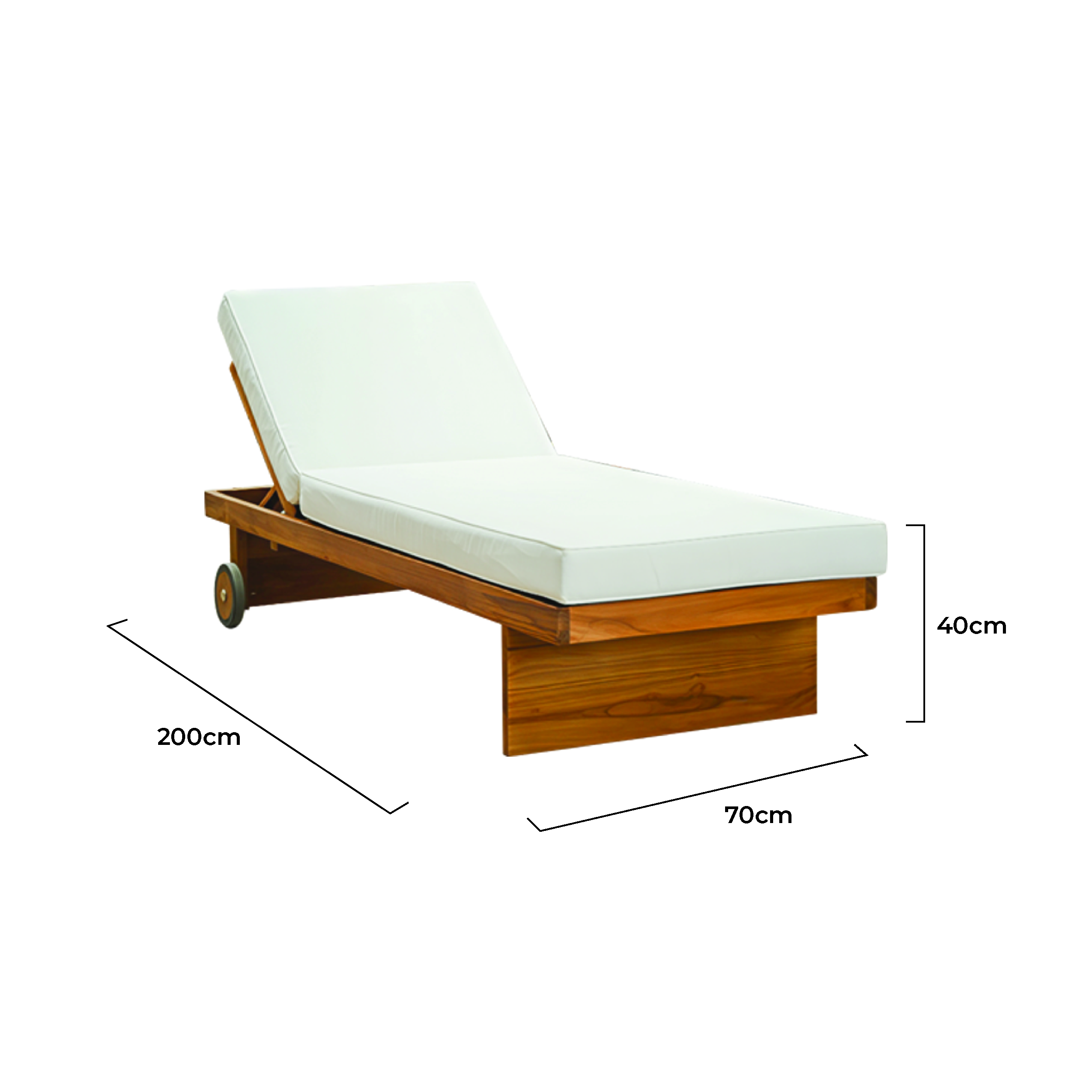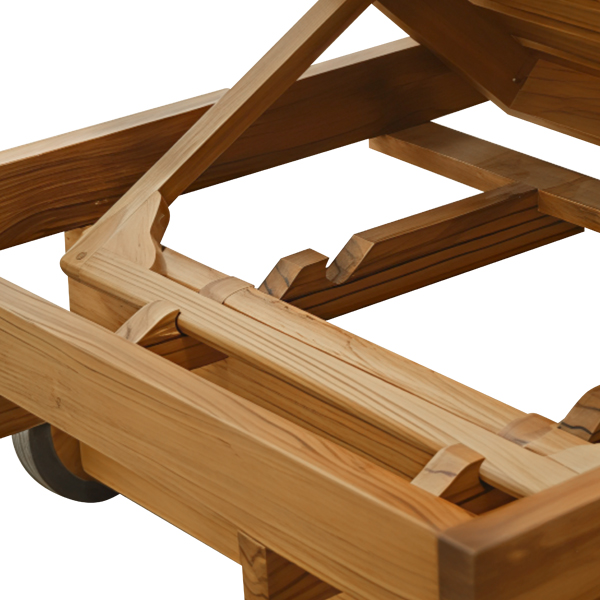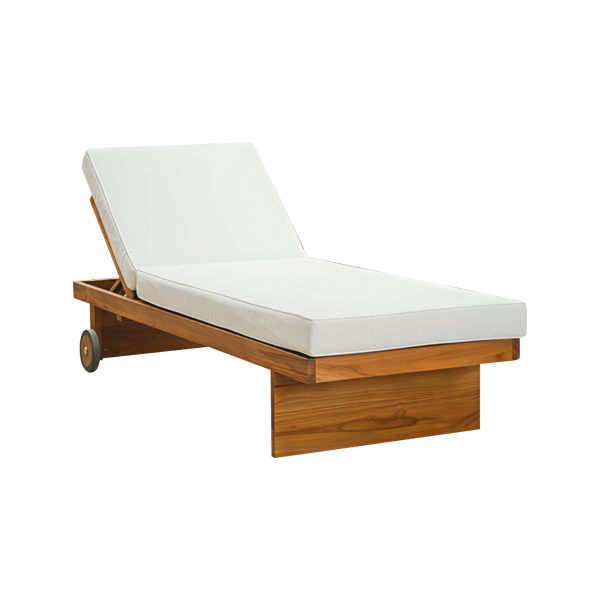 Cushioned surface features high-quality 26-density foam and weather resistant SR-10 outdoor fabric. Not only is the texture soft and breathable, but it also stands up to various weather conditions. Ensuring a cozy lounging experience all year round. Underneath, precisely spaced teak slats promote optimal airflow while providing robust structural support. Moreover, the adjustable wooden backrest offers four reclining positions, allowing you to sit upright, recline, or lie down in total comfort. For added convenience, the sunbed includes rear wheels crafted from teak and rubber. These wheels offer smooth mobility without compromising its elegant design. Meanwhile, the front legs, also made of solid teak, ensure lasting stability and strength. In terms of ergonomics, seat height makes it easy to get on or off the sunbed. Minimizing tension and improving overall relaxation. A natural wood finish highlights the intricate teak grain, enhancing its timeless tropical charm.