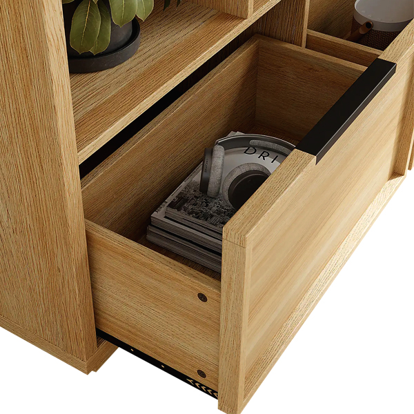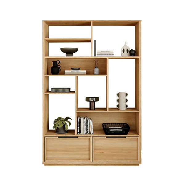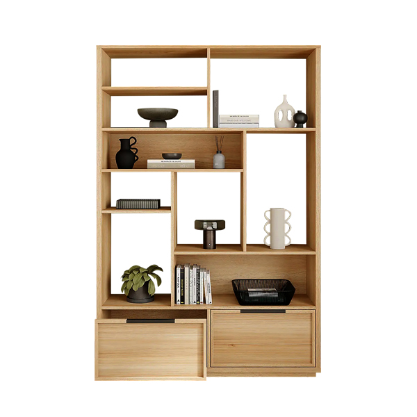 Its open design creates an illusion of a larger, modern space. The asymmetrical shelving adds a unique character, transforming the bookshelf into a decorative element that beautifies the room. The varied, open layout allows for flexible organization of books, decorative plants, and personal collection. The top of the bookshelf provides ample space for showcasing home decor, while the two closed compartments below offer additional storage for items you wish to keep out of sight, such as documents and small household tools. This makes the Kiana Bookshelf not only visually appealing but also highly practical for various storage needs.