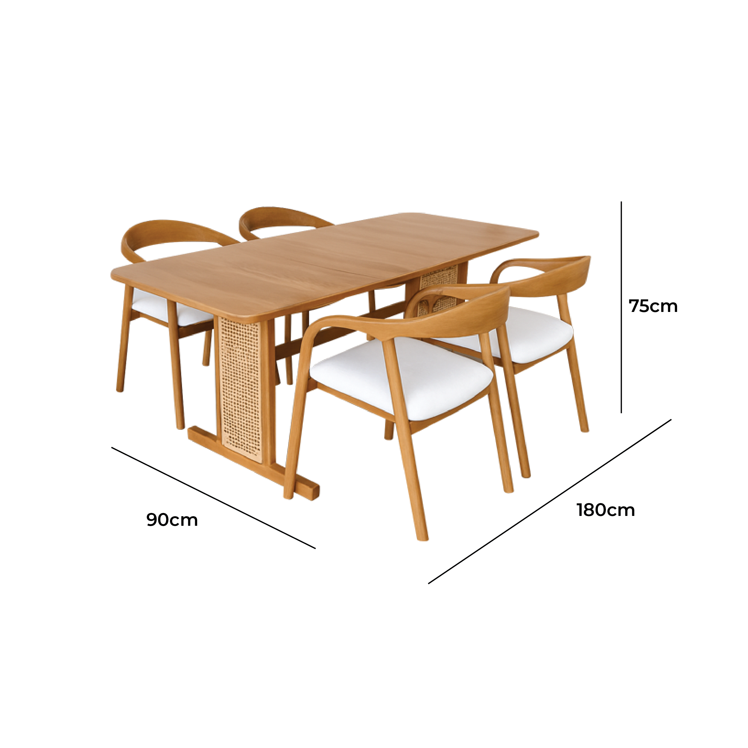 Table measures 180 cm in length, 90 cm in width, and 75 cm in height, offering generous space for four people to enjoy meals together. Moreover, its rounded corners add a safe and stylish detail. The main uniqueness lies in its table legs, which differ from common commercial designs. In addition, woven rattan accents emphasize the artistic character while delivering a warm tropical touch. A solid middle support strengthens the structure, ensuring long lasting durability. This set includes four armchairs with ergonomic designs. Each chair features a curved backrest integrated with arm support, providing extra comfort for longer sitting. Furthermore, the seat cushion is upholstered with soft, plush fabric for a cozy feel. Slightly angled chair legs reinforce the modern minimalist look. They also add stability while perfectly balancing the height of the table, ensuring ergonomic seating. With smooth transitions between wood, fabric, and rattan, this dining set creates a unique visual harmony. As a result, the dining space looks warmer, more artistic, and modern at the same time.