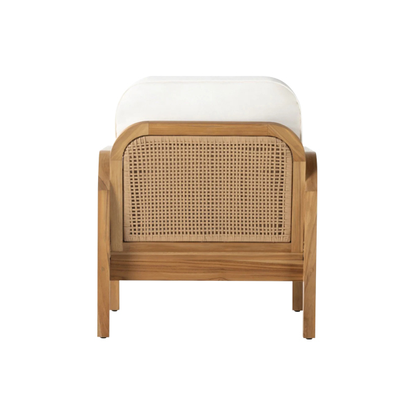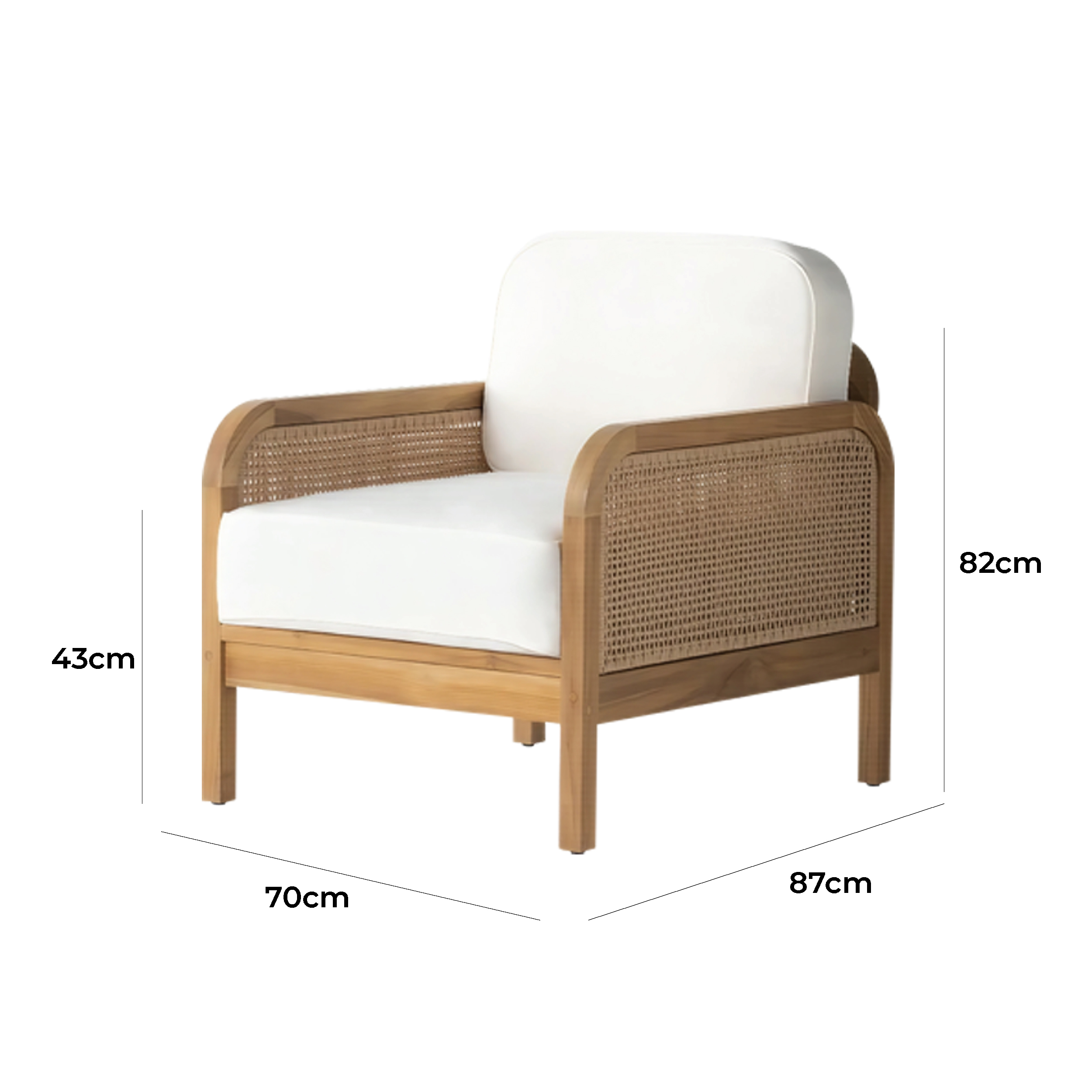 Crafted with a teak wood frame, it highlights the authentic beauty of natural grain. Moreover, the sides and back feature natural rattan weaving, offering both aesthetic and classic charm. This chair balances tradition with modernity in perfect harmony. The seat and backrest use thick, soft foam with smooth white fabric upholstery. As a result, it creates a clean and elegant impression. Neat stitching along every edge enhances the artistic details. In addition, the removable cushion system adds practical value for easy maintenance. Its square shape with rounded corners creates a soft yet sturdy impression. Meanwhile, the low square legs emphasize modern minimalism. Natural finishing on the teak frame brings warmth to any room. Furthermore, small rubber pads under the legs protect the floor from scratches. With proportional dimensions of 70x87x82 cm and a seat height of 43 cm, it delivers maximum comfort without sacrificing aesthetics.
