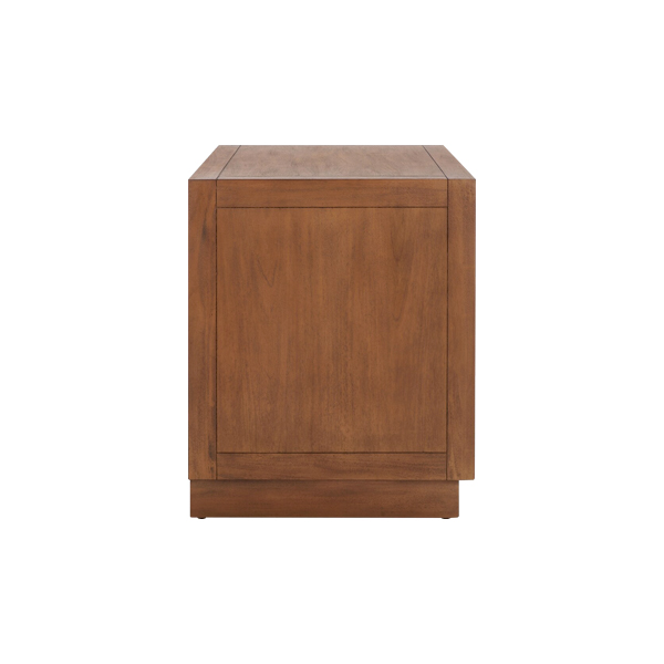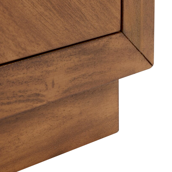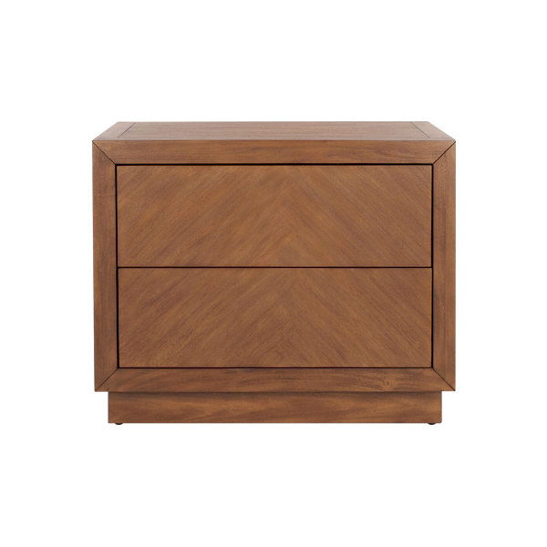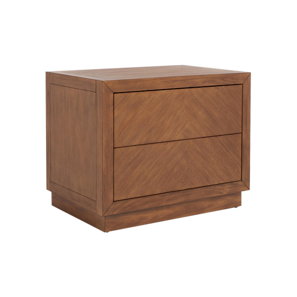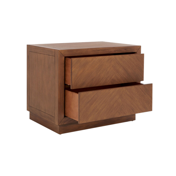 Minimalist and modern design is evident in its clean lines and sharp angles. A spacious tabletop provides ample room for a bedside lamp, a novel, or decorative ornaments. Two large vertically arranged drawers offer generous storage capacity. Ideal for keeping accessories, documents, or other personal essentials organized. Integrated base seamlessly connects to main frame, creating a solid and sturdy appearance without additional legs. Brown finish enhances the warm ambiance, reinforcing the elegant character of the wood material. Every edge and surface is symmetrical wood grain patterns that elevate the furniture’s natural aesthetic. Each nightstand is unique due to its natural wood grain variations, making it an exclusive piece.