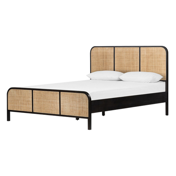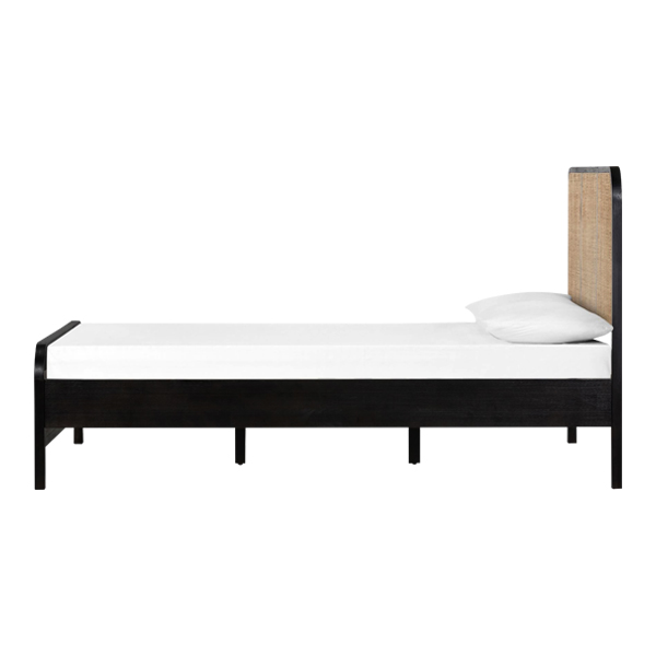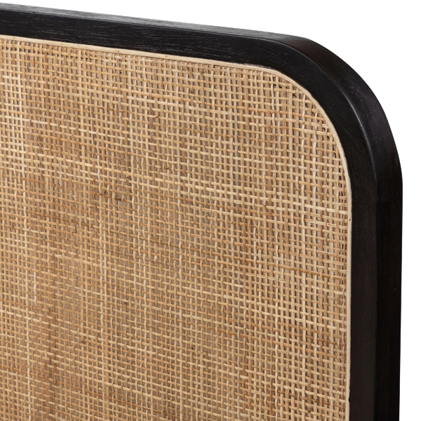 Nirjara Boho Bedframe is a sophisticated bedroom furniture piece that combines classic bohemian and minimalist aesthetics. Crafted with a solid black teak wood frame and accent with natural rattan weaving, this bedframe exudes warmth and style. Measuring 160x210x120 cm it offers ample space making it ideal for couples or individuals who appreciate luxury in simplicity.