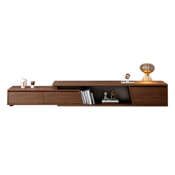 This TV console also offers practical storage solutions with multiple functional compartments. On the left side, a closed drawer provides a clutter-free storage area for electronics and other items. The center section features an open, asymmetrical display space, ideal for showcasing books, decorative figurines, or other cherished items. Right side of the console includes an additional closed compartment for more private storage needs. The sleek, structured design of each section adds to the console’s elegant and modern appearance. More than just a piece of furniture, this TV Console is a work of art that elevates the aesthetics and functionality of your living space.