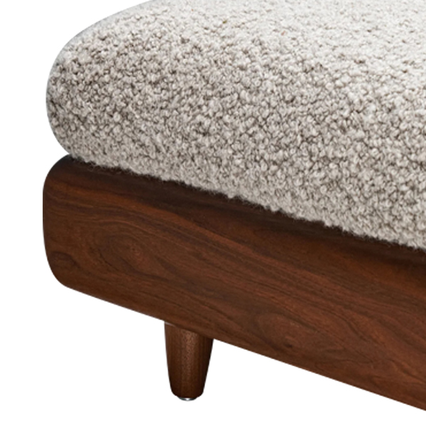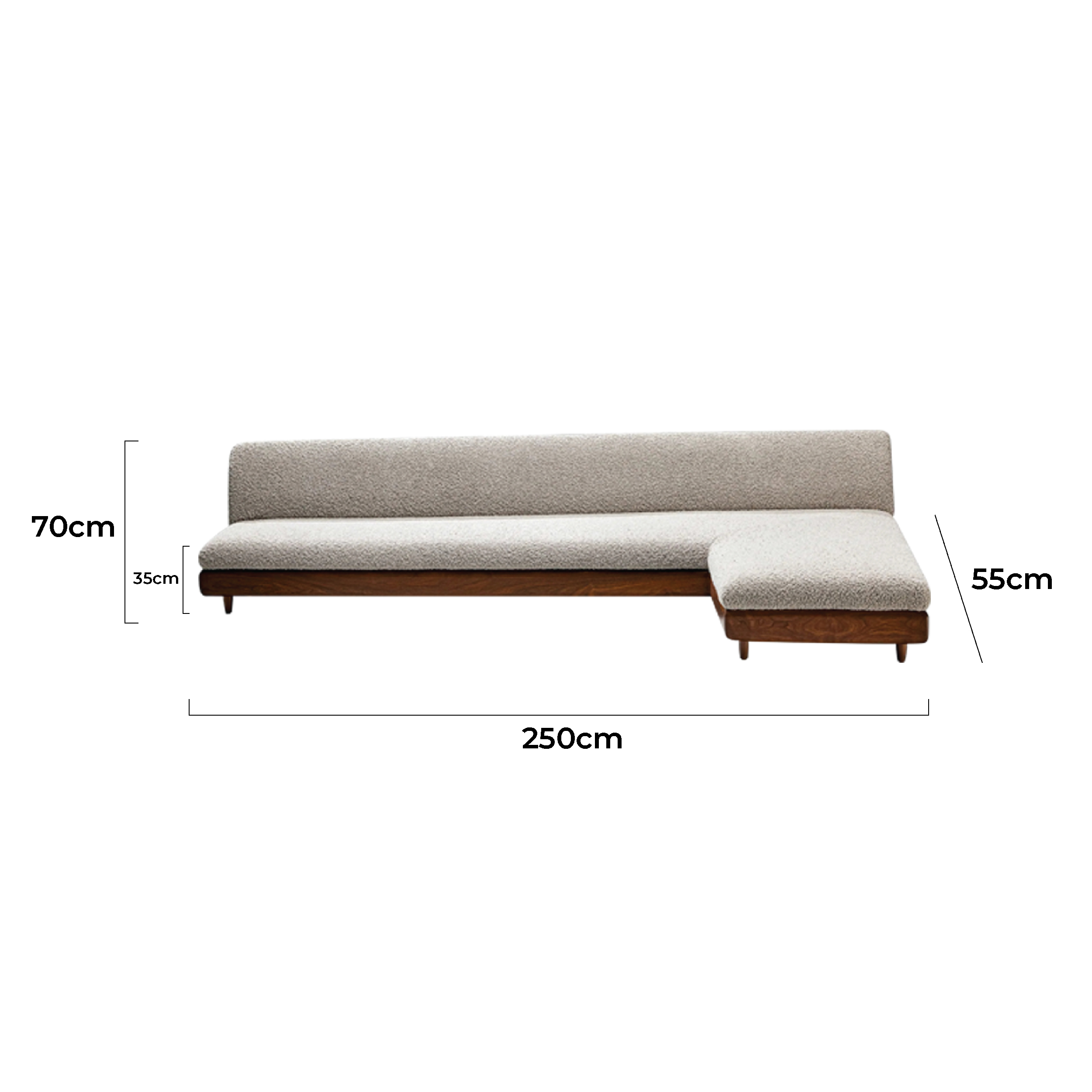 Solid teak wood frame with a walnut finish showcases natural grain beauty, adding luxury and durability. Meanwhile, its low, tapered legs enhance minimalist character and provide stability to the design. The ergonomic backrest features plush foam with a density rating of 26, ensuring long-lasting comfort without sagging. This sofa is both visually appealing and ideal for extended sitting sessions. Measuring 250x55x70 cm, it suits modern and cosmopolitan living spaces. Pair it easily with square coffee tables to create a harmonious interior layout. Light-colored fabric and walnut wood make this sofa a striking focal point that elevates any room, adding artistic elegance. Neat, precise stitching reflects expert craftsmanship and meticulous attention to detail. It is more than functional furniture; it is a statement piece that enhances your home. Perfect for those prioritizing aesthetics, comfort, and long-term investment in quality furniture.