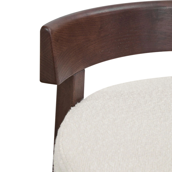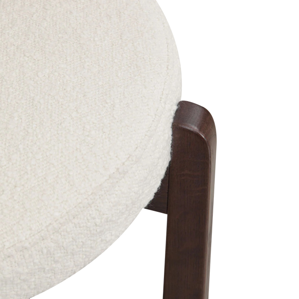 Seat is in soft white boucle fabric, providing extra comfort while presenting a modern color harmony. Round shaped seat delivers ergonomic support. Curve backrest follows the body’s contour and features a central air circulation, making the sitting experience more breathable and relaxing. Height of this stool reaches 90 cm with a seat height of 65 cm, ideal size for kitchen islands or bar. Its angled four leg base provides strong balance. While the crossed design in the middle frame offers both reinforcement and a unique visual element. Additionally, the front legs include a footrest for a more sitting position. Small rubber protectors at the bottom prevent floor scratches. With a smooth design transition between contemporary style and natural elements. This stool serves as a unifying accent across interior concepts such as Scandinavian, modern, and Japandi.