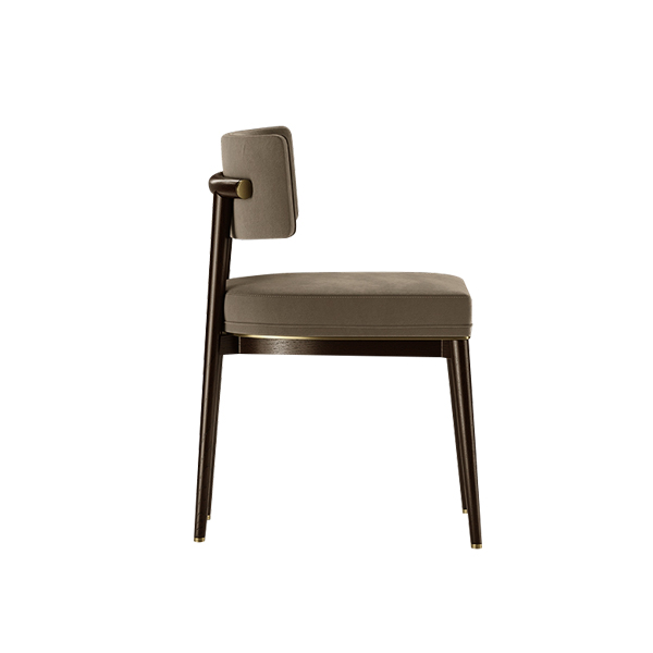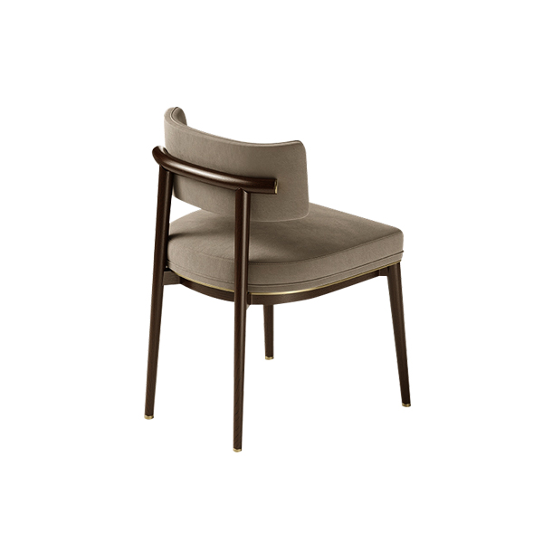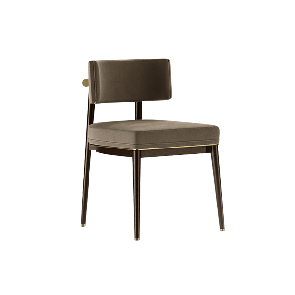 Boasting a slim silhouette with clean, precise lines, the Soma Chair radiates understated luxury. The solid teak wood frame, finished with a matte black coating, accentuates the natural texture of the wood, while expert construction ensures flawless detailing for a polished, high-end look. Golden accents on the legs and lower frame add a touch of opulence, elevating its overall appeal. The seat and backrest are with soft brown fabric, offering a neutral tone that effortlessly complements a variety of interior themes. The rich hue also adds warmth and a welcoming atmosphere to your space. The foam padding guarantees optimal comfort, making it ideal for long sitting sessions, whether for casual conversations or extended work hours. This cafe chair encourages proper posture making it perfect for both relaxing moments and productive work at cafe. Its slender yet sturdy legs provide excellent stability and ensure a secure seating experience.