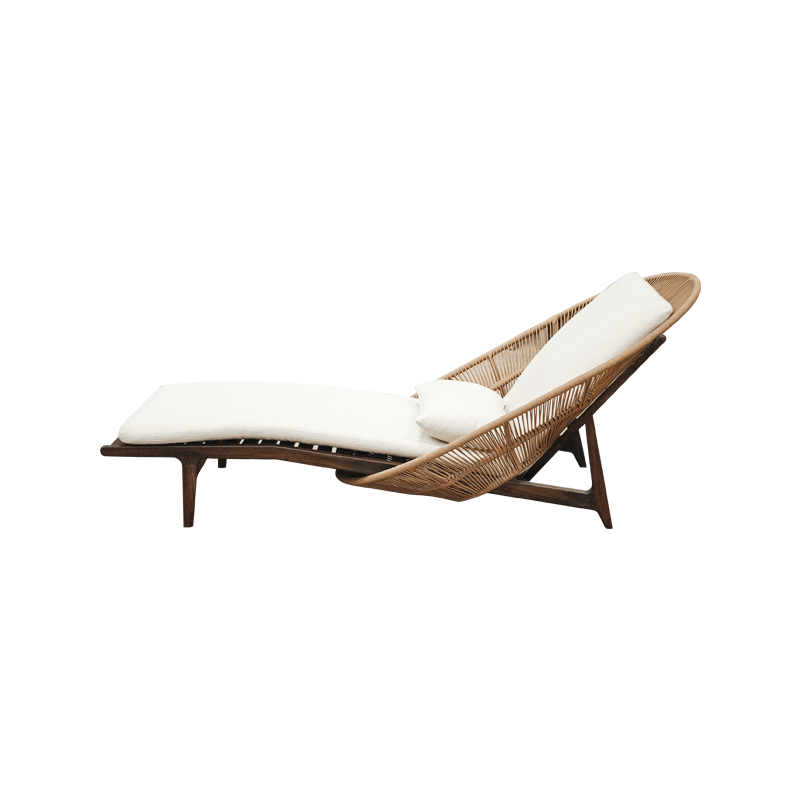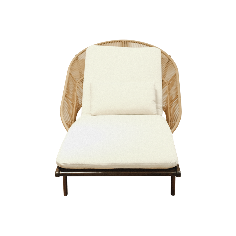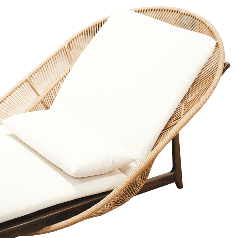 Main frame uses teak wood, which showcases beautiful natural grain character. Furthermore, it harmoniously combines with woven rattan rope that forms an artistic backrest structure. Interestingly, the backrest resembles a half-circle curve inspired by the shape of a sunset. Therefore, it not only enhances the aesthetic value but also symbolizes day-long comfort while enjoying moments of relaxation. Meanwhile, the tapered legs create a light and minimalist appearance while maintaining strong construction. In addition, the custom dark wood finishing further emphasizes an elegant yet natural character. Base surface of the sunbed features parallel wooden slats, commonly found in garden furniture. As a result, this design allows better air circulation while strengthening the seating structure. On top of the frame sits a foam cushion with density 26, offering an ideal balance between softness and body support. Moreover, the cushion is wrapped in Sunny Guard outdoor fabric series 10 in a natural tone. The cushion also includes a practical strap system attached to the frame, which simplifies the cleaning process. Additionally, a bolster pillow serves as an accessory to enhance comfort.